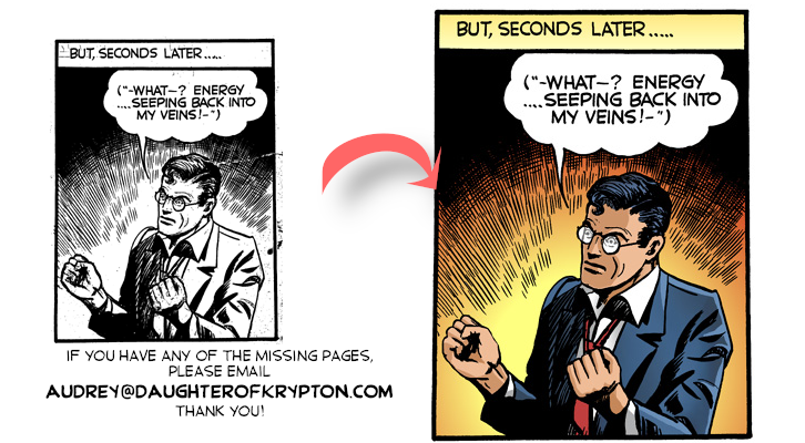 ORIGINAL ARTWORK WANTED![]() When we first started the K-Metal restoration project, the only original artwork that we had copies of was pages 5, 8, 11, 13, 15, 21 and 23. Since that time, through the help of visitors to this site, we have also obtained copies of original pages 7, 9, 12, and 20 (2005). Many have been discovered in old art catalogs. (2007: Page 1; 2008: Page 17 discovered; 2025: Pages 2, 4, and 22 discovered) If you are an owner of any of the original artwork or have copies of any of the additional original pages, please contact us. Even if we have already published our own version of the page, we will replace it with a restored version of the original page by the original artists. Out of the total 26 pages in the story, almost 11 are still lost to history: 3, 4, 6, 10, 14, 16, 18, 19, 24, 25, and 26 — waiting to be discovered. However, we have created our own versions of these missing pages in order to present The Secret of the K-Metal! as a complete, readable, full-color comic book. Some of the formerly missing pages were discovered after we had created our own versions. In a few of these cases, we present both the 1940 version along side our own, so that the reader may enjoy two different interpretations of the same page. But when we are able to, we replace our earlier-created version with the new restored, full-color version of the original Shuster Studio artwork. |