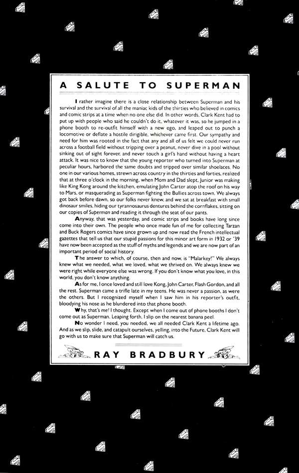 ·  Front Cover  ·  A Salute to Superman  ·  "The Living Legends of Superman!"  ·  Brian Bolland Pin-Up  ·  Jack Kirby Pin-Up  ·  "Doc Homer's Superman Nectar!"  ·  John Byrne Pin-Up  ·  Jack Davis Pin-Up  ·  "The Legend From Earth Prime!"  ·  Leonard Starr Pin-Up  ·  Walt Simonson Pin-Up  ·  "Resistance!"  ·  Bernie Wrightson Pin-Up  ·  "Our Greatest Treasure!"  ·  Will Eisner Pin-Up  ·  "Last Son of Krypton!"  ·  Steve Ditko Pin-Up  ·  Mike Grell Pin-Up  ·  "The Miracle Monday Dinner!"  ·  Moebius Pin-Up  ·  "The Exile at the Edge of Eternity!"  ·  Bill Sienkiewicz Pin-Up  ·  Jerry Robinson Pin-Up  ·  Back Cover  ·