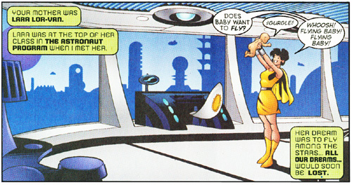 from Superman #166, 2001In this newest re-interpretation of Superman's classic origin, as told by Jeph Loeb and Ed McGuinness, it was revealed that John Byrne's vision of Krypton as a cold and antiseptic dystopia was in actual fact a fiction - a "folly" that Jor-El had constructed in an attempt to prevent Superman from having to suffer the emotional agony of mourning the death of a beautiful civilization - the true world of his birth, a Krypton very much like the Silver Age version. In effect, both versions of Superman's origin were successfully acknowledged and incorporated into the legend. Superman's and Krypton's heritage were now restored to their former glory.