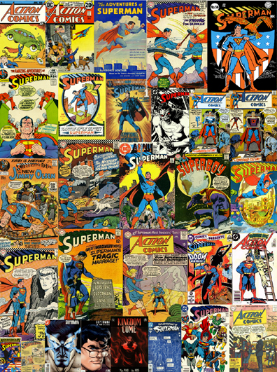This Super-wallpaper was created and contributed by Michael L Szott! "Here's a new wallpaper. I've used some of the covers on your site and used additional covers from other sites." MORE SUPERMAN WALLPAPER Superman TM & © DC Comics Superman Fan Gallery