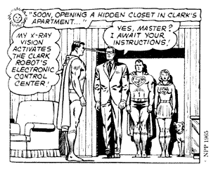 In March 1944 Clark Kent uses a Superman dummy to help him outwit the Thinker, employing ventriloquism to make the dummy appear to talk. In September 1949, Superman employs a Superman robot in an elaborate scheme to dupe a band of aliens from the planet Uranus into believing that all earthlings are actually robots. Superman makes his robot appear lifelike by manipulating it like a puppet at invisible super-speed while employing ventriloquism to make it talk. As the years progress, the Superman robots become progressively more advanced. By May 1958, Superman has succeeded in devising robots so sophisticated that his Clark Kent robot - kept concealed behind a secret panel in a supply room at the Daily Planet - is actually capable of carrying on his duties at the Daily Planet whenever his presence is required elsewhere as Superman. "The robot Clark will replace me here in the office, as usual!" thinks Superman. "Remote-control impulses from my X-ray eyes will guide him and operate his voice box!" Superman also utilizes a sophisticated Superman robot during this period to carry out a mission in outer space. In December 1958, Superman has begun housing several Superman robots in a secret closet in Clark Kent's apartment, each equipped to duplicate one of Superman's super-powers, such as super-strength, the power of flight, X-ray vision, or super-breath. "Each is designed to use one of my super-powers when needed!" notes Superman. "I send out the robots when Clark's absence would be suspicious! Or when I suspect that criminals are waiting to use kryptonite against me!" By January 1960 Superman has clearly increased the complexity of his robots even further, for he is now quoted in the Daily Planet as saying that "my robots possess all my super-powers." In February 1960, when Superman conducts guided tours through his Fortress of Solitude for the benefit of charity, two of his Superman robots stand outside, scanning the incoming crowds with their X-ray vision to ensure that no bombs or other dangerous devices are carried into the Fortress. Indications are that the robots are carrying out their duties autonomously, without any outside help from Superman. In June 1960, Superman, busily occupied with putting on a demonstration of his super-powers for children at a local hospital, dispatches a Clark Kent robot to keep a lunch date with Lois Lane, confident that the robot is so thoroughly lifelike that Lois will not be able to tell it from a human being. In March 1961, one of Superman's Superman-robots, acting entirely on its own volition, carries out an intricately convoluted ruse involving human emotion, sophisticated independent thinking, and the ability to invent and construct complex scientific devices. (Action Comics #274)