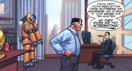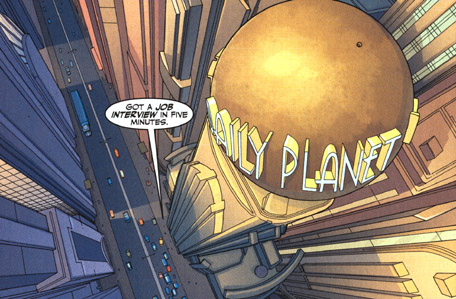 Before the aforementioned pulse-racing panel, we're also reintroduced to the Daily Planet and the classic trio of Jimmy Olsen, Perry White and Lois Lane. Jimmy was, well.... Jimmy, though this time around curiously without his trademark freckles. Perry had a little more bark and bite to him than I've seen lately in the Superman books, which only helped enhance the enjoyment of Clark's grilling in Perry's office.