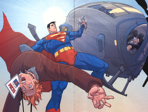 I must admit, the reason Clark was awed was not as clear to me as Mark Waid might have hoped it would be. I thought Waid overplayed his hand a bit with Clark thinking that he was "in love" after witnessing Lois sticking up for Jimmy. I understand how Clark would admire someone who shares his need to "stick up for the little guy," but the "love at first sight" thing was too much, too soon... and was something I'd hoped someone of Waid's caliber would naturally avoid. However, Lois was much less the snarling, acerbic Fem-Bot she's normally portrayed as, which is a refreshing change for the better. But, she's still Lois, as demonstrated by her impulsive "borrowing" of the Daily Planet's helicopter.