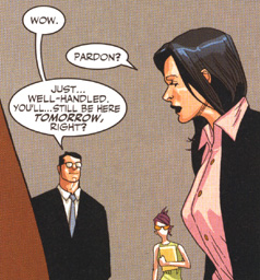 The first role is the "new" Clark Kent he and his parents devised last issue. After years of DC blurring the distinctions between Clark Kent and Superman, the return of the distinctive, mild mannered Clark was a welcome change...and an encouraging sign that Mark Waid truly "gets" the core concepts of the Superman character. Waid seems to understand that there are many gradations between the Geek-Spaz Caricature (where even the Christopher Reeve performance occasionally strayed) and John Byrne's sturdy, self-assured GQ model. This Clark Kent seems to rest comfortably somewhere between those two inauthentic, irritating extremes.