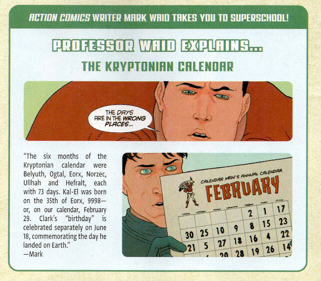 | 47 Ullhah 9997 | Jor-El and Lara Lor-Van wed. The spacetime-traveling Superman, using his Kryptonian name, Kal-El, is present for the ceremony. Superman has befriended Jor-El and Lara, but has not revealed to them his true identity.