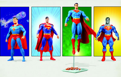 Don't miss this amazing Gift Set which features some of the greatest Superman figures of all time! The set consists of four different 6" scale versions of Superman, including the Jim Lee Superman, First Appearance Superman and Robot Superman! Each figure features a new head and cape, multiple points of articulation and a display base. This set is packaged in a 4 color window box with a full-size 48-page comic book compiling material from ACTION COMICS #1, SUPERMAN (Second Series) #7, and AMAZING WORLD OF SUPERMAN!