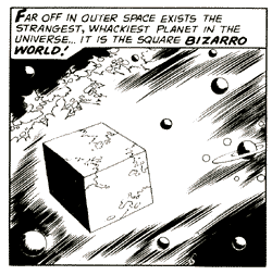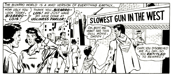 Together with Bizarro-Lois, Bizarro rules the far-distant planet Htrae, a wacky, cockeyed world where all the men are imperfect imitations of Superman and all the women are distorted doubles of Lois Lane. It is to distinguish himself from all these other male Bizarros that the original Bizarro has taken to wearing a large medallion around his neck plainly identifying himself as "Bizarro No. 1"