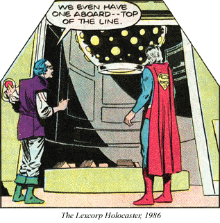 First made known in February 1986 (S No.416/2: "The Ghost of Superman Future!") when an aged and retired SUPERMAN, no longer living on Earth but now wandering the starwinds, grants a rare interview to a group of galactic news reporters. Reminiscing about his friendship with Luthor, Superman makes reference to the "Lexcorp Holocaster," the "best hologram filming system ... I've seen in the universe!"