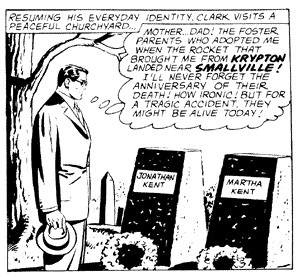 In the town of Smallville, where they lived, they were known as good neighbors and fine citizens. Superman has described them as the best foster parents who ever lived. The early texts are inconsistent regarding the first names of Superman's foster parents: referred to only as the Kents in Superman #1 (Summer 1939), they are referred to as John and Mary Kent in Superman #53. Superman's foster father is called Silas Kent in Action Comics #132 (May 1949), but he is consistently referred to as Jonathan Kent from July 1951 onward. Superman's foster mother is first called Martha in January 1952, a name she retains from that issue onward, with the sole exception of Action Comics #189, in which her first name is misspelled Marthe. Similar confusion exists regarding Martha Kent's maiden name: given as Martha Hudson in Superman #141 and as Martha Clark in Superman #146, it has, in recent texts, been given as Martha Hudson Clark as a means of rectifying the discrepancy. At the time he proposed marriage to his wife-to-be, Jonathan Kent was a quiet spoken young farmer and she was an attractive young brunette, but by the time the tiny rocket ship bearing the infant Kal-El, son of Jor-El, one day to be known to the world as Superman, soared through the Earth's atmosphere and landed in an open field, the Kents were already gray-haired, certainly into late middle-age, perhaps "elderly," without children of their own, working their own modest farm somewhere outside of Smallville. The texts are not entirely consistent on the question of where the Kents were living at the time they found the infant Superman: Superman #73 strongly suggests that the Kents were residing in Metropolis at the time the rocket landed, and Action Comics #106 asserts that they came upon the rocket within the Metropolis city limits. Numerous other texts, however, state that the rocket landed near Smallville, evidently within short driving distance of the Kents' farm. According to Action Comics #1, the rocket ship bearing the infant Superman was discovered by a passing motorist, but Superman #1 and numerous other texts assert that the infant was found by the Kents, who happened to be passing by in their car moments after the rocket landed. The baby was swathed in the blue, red, and yellow blankets that the Kents later used to fashion his Superman costume. In his hand he clutched the jewel-like iron-destroying projector that had been placed inside the rocket by his father, Jor-El, (Action Comics #172, 1952). Scarcely had the Kents removed the infant from the rocket, however, when the space-ship's metal, foreign to Earth's climatic and chemical makeup, burst into flame. Within seconds, not a trace was left. Later texts echo this brief explanation of the rocket's destruction, asserting that the rocket burned because the metal from which it had been fashioned was a substance alien to our Earth or because its metal was alien to our atmosphere. A more plausible explanation, however, is advanced by Superman #146, which states that all people and things from Krypton become invulnerable on Earth and that only the explosion of its super-fuel had the power to wreck the rocket. Within a few brief seconds, not even a trace of the rocket was left. "If we tell what happened," mused Jonathan Kent aloud, "nobody will believe us!" "We'll say we found an abandoned baby," replied his wife, "...which is true!" All accounts agree that the Kents turned the infant from space over to an orphan asylum immediately after having found him. Action Comics #288 refers to the orphan asylum as the Smallville Orphanage, while Superman #161 calls it the Smallville Orphan's Home. Accounts differ, however, on the question of whether the Kents decided to adopt the infant Superman immediately or whether they formulated these plans later. According to Superman #1, the Kents delivered the baby to the orphanage and then returned sometime later to adopt him only after discovering that they were unable to get the sweet child out of their minds, but Superman #53 asserts that the Kents applied for adoption immediately and left the infant Superman at the orphanage only temporarily, long enough for their application to be properly investigated. The baby caused such a pandemonium at the home, continues the text, with the unrestrained use of his super-powers, that the authorities rushed through the Kent's adoption in record time just so they could be rid of the problem infant. Once having adopted the youngster, the Kents realized they needed to give him a name. "At last, we've a son of our very own!" exclaimed Martha Kent as they drove their newly adopted son home from the orphanage. "What shall we call him?" "We'll name him after your family..." replied Jonathan Kent. Then he turned to their new son and said, "Hello, son! You have a new name! From now on you'll be Clark... Clark Kent!" According to a later version (July 1961), it is Mrs. Kent who names the youngster. In this text, Jonathan Kent asks his wife to select a name for their newly adopted son, to which Martha Kent replies, "I'll use my former last name before our marriage... Clark! Our son will be Clark Kent!" Clark Kent's early childhood years following his adoption were spent on his foster parents' farm outside of Smallville. It did not take long for the Kents to discover that their newly adopted orphan from outer space was endowed with extraordinary super-powers, including invulnerability, X-ray vision, and strength far beyond that of any ordinary mortal. Indeed, it was because the infant Superman kept unintentionally demolishing his conventional baby clothing during energetic bouts of super-powered play that the Kents unraveled the colored blankets which they had found wrapped around him in the rocket and used them to fashion the colorful super-playsuit that became the forerunner of his now world-famous costume. By the time Clark Kent was old enough to attend school, the Kents sold their farm and moved to Smallville, w