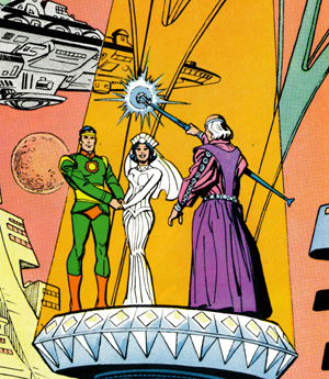 Superman #65 makes reference to Krypton's ruling council, which consisted of the planet's ten leading scientists, a clear suggestion that Krypton's leading scientific body governed the planet, but Action Comics #223 distinguishes between the Council of Science and Krypton's highest officials, suggesting that the Council, while influential, was not really charged with the responsibility of ruling the planet. Superman #154, however, contains a brief reference to a Supreme Council, a title clearly suggestive of supreme political authority. All in all, then, it is probably safest to infer that Krypton was ruled by a political body, probably elected, which was counseled and advised by a body of distinguished scientists exercising considerable influence over political decision making. The capital of Krypton was the city of Kandor. Several years before Krypton exploded, however, Kandor was reduced to microscopic size and stolen by the space villain Brainiac, and a new world capital was established in the city of Kryptonopolis, the city which would later become Superman's birthplace. Fluttering from the flagstaff atop the World Capitol Building - which, like the city of Kryptonopolis itself, had been designed by Superman's ancestor Gam-El, the father of modern Kryptonian architecture - was the flag of Krypton, a multicolored banner consisting of pale rays of blue, yellow, lavender, white, green, orange, pink, light green, and red radiating outward from a circular center featuring a green and pale blue design suggestive of a body of water all but encircled by lush green land. Maintaining public order was the role of the Krypton Security Force, while the task of maintaining internal security and apprehending criminals was entrusted to the Krypton Bureau of Investigation. Crime was only a minor problem on Krypton. Indeed, the research of the Kryptonian scientist Raf Arlo had established that most of the crimes on the planet were perpetrated by an unknown race of invisible people. When malefactors were apprehended, they were placed on trial in Kryptonian courtrooms where verdicts were handed down by Kryptonian justice councils, deliberate bodies analogous to American juries. Because Kryptonians were opposed to capital punishment, and, in fact, had never in their history practiced it, the perpetrators of serious crimes were exiled into space in a state of suspended animation inside space capsules constructed specially for the purpose. According to Superman #65, the space capsules were made of transparent plastic and shaped like rocket ships, but according to Superman #123, the so-called "prison satellites" were of a spherical shape. The criminals imprisoned inside them were placed in suspended animation by means of a special sleep gas, and chunks of a glowing crystalline mineral - capable of cleansing their brains of criminal tendencies in a hundred years' time - were placed on their foreheads so that ultimately, once their sentence was served, they might take up constructive roles in Kryptonian society. The practice of exiling criminals into outer space was terminated, however, after Superman's father, Jor-El, discovered the Phantom Zone, a twilight dimension to which criminals could be banished to serve out their sentences as disembodied wraiths. One of the most important government departments was the Krypton Record Bureau, where complete records of every Kryptonian's life were maintained on ingenious thought-projection discs. According to Action Comics #149, such important events as courtship and marriage were recorded astro-electricly, from each person's memory. By concentrating on one of those discs - in a darkened room - anybody could cause a complete image of remembered events to appear.