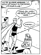 Since Superman has the power to travel in time, it is possible for him to journey to the thirtieth century A.D. to visit the Legion either during the period when they are teen-agers or during the period when they are adults.  By the same token, since the Legionnaires are able to time-travel also, it is possible for them to return to the twentieth century to visit Superman either as teen-agers or as adults.  For this reason, the Legionnaires appear in the chronicles sometimes as teen-agers and sometimes as adults.  And as adults, the Legionnaires often have different names from the ones they employed as teen-agers.  The adult Cosmic Boy is called Cosmic Man the adult Lightning Lad is called Lightning Man; the adult Saturn Girl is called Saturn Woman; and so on.