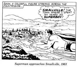 It was near Smallville that the experimental rocket bearing the infant Superman landed after its journey through space from Krypton.  The Smallville Orphanage, where the Kents brought the infant Superman immediately upon finding him, and where he remained for a brief period preceeding his adoption, is located in Smallville.  The Kents' farm, where Superman spent his early childhood years, is located somewhere outside of Smallville.  The Kents' home, where the family moved after selling their farm and where Superman spent the remainder of his boyhood, is located in Smallville, as is Jonathan Kent's general store where Clark used to work afternoons after school.