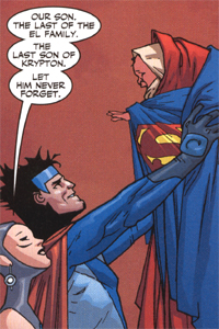 And what about how Waid has tweaked even the physics behind Superman's powers? He apparently gains super-strength as a young child, and not gradually over time. It's also implied that Jor-El believes Kal-El will be super-powered immediately after arriving on Earth. Think about it: Jor-El doesn't really know if there are living beings on Earth, so I would guess he's assuming Kal will wander around on his own….so for him to be confident Kal will be okay on Earth, I would think Jor-El is assuming the sun would immediately power him up and protect him from harm. Interesting.