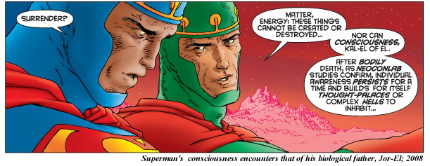 "Superman was coming back into his body again.  He felt the familiar organs of his chest and stomach appearing back where they belonged, the dark viscous blood coursing through his arteries faster than a speeding bullet.  It was Luthor's voice he was hearing now, rooting for him, urging him back to the world of three dimensions and energy-matter relationships, where there was a good and an evil and where the distinction was not very difficult to make."  (Last Son of Krypton 25)